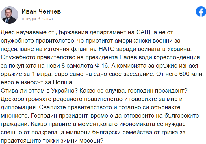 Парламентаристът от БСП и член на Националния съвет на партията Иван Ченчев нападна президента Радев за дислокацията на елитната бойна група от САЩ "Крещящите орли" и за сделката с изтребителите Ф-16 преди предстоящата тежка зима.