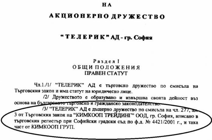 Чл. 1, ал. 3 от устава на "Телерик" гласи: "Телерик“ АД е дъщерно дружество по смисъла на чл. 277, ал. 3 от Търговския закон на "КИМКООП ТРЕЙДИНГ" ООД, гр. София, вписано в търговския регистър при СГС по ф.д. №4421/2001 г. и така част от "КИМКООП ГРУП".