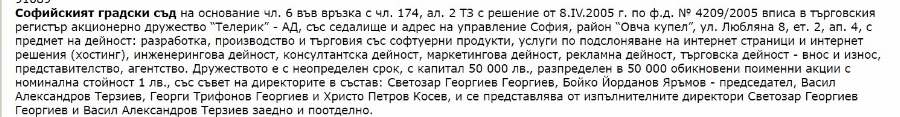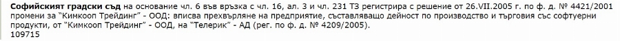 Това са Александър Трифонов, Христо Караколев, Красимир Стоянов и Златко Златев. Съдебните регистри по решението за вписване на "Телерик" АД съхраняват и други части от пъзела - в началото на пътя, когато за всеки е най-тежко: На 12.07.2005 г. Георги Трифонов Георгиев - управител на "КИМКООП ТРЕЙДИНГ" ООД, подава заявление, с което иска съдът да впише "прехвърляне на предприятие, съставляващо дейност по производство и търговия със софтуерни продукти от "КИМКООП ТРЕЙДИНГ" на "Телерик" АД“.