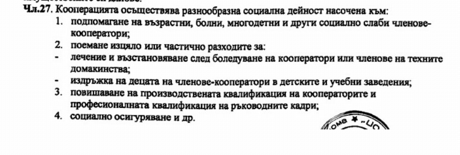 Интересна подробност се открива още в устава на "КООПЕРАЦИЯ КИМКООП", където е записано: Чл. 27. Кооперацията осъществява разнообразна социална дейност, насочена към: 2. поемане изцяло или частично разходите за: - издръжка на децата на членове-кооператори в детските и учебни заведения".