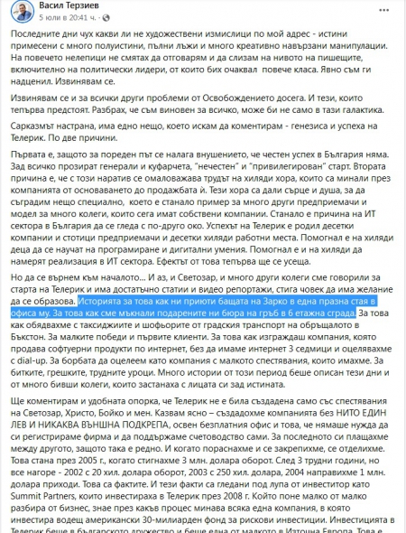 "И когато пораснахме и се закрепихме, се отделихме. Това стана през 2005 г., когато стигнахме 3 млн. долара оборот. След 3 трудни години, но все нагоре - 2002 с 20 хил. долара оборот, 2003 с 250 хил. долара, 2004 направихме 1 млн. долара приходи. Това са фактите. И тези факти са гледани под лупа от инвеститор като Summit Partners, които инвестираха в Телерик през 2008 г. Който поне малко от малко разбира от бизнес, знае през какъв процес минава всяка една компания, в която инвестира водещ американски 30-милиарден фонд за рискови инвестиции. Инвестицията в Телерик беше в българското дружество и беше една от малкото в Източна Европа. Това е доказателство каква компания бяхме изградили с колегите. И от която всички ние, които бяхме в основата на успеха на Телерик, продължаваме да се гордеем. И в която никога не е имало ДС пари. Имало е наши пари и инвестиция на Summit Partners. Ако някой твърди друго – лъже. А за да докажа всяка дума, аз нямам никакъв проблем да отида на детектор на лъжата и да се види истина ли е написаното горе или не".