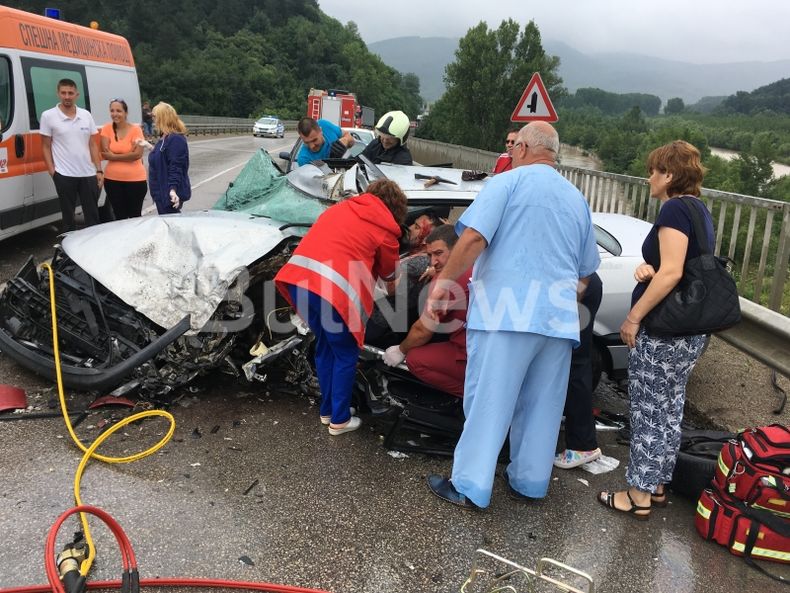 Спешните медици се борят на място за живота на затиснатите мъж и жена, които са в монго тежко състояние и целите в кръв.