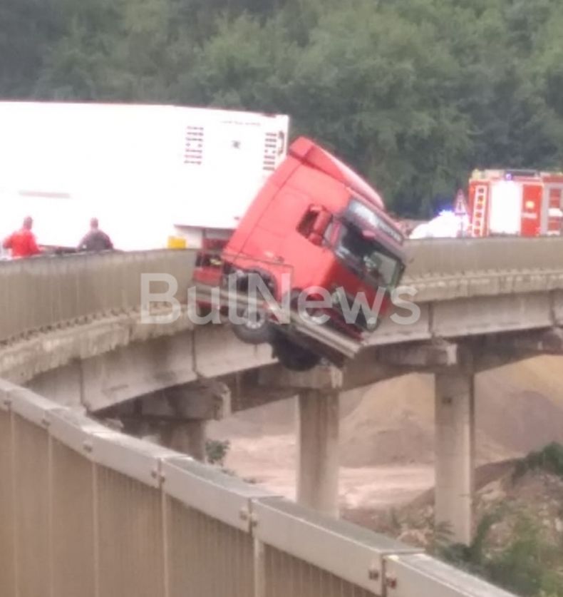 От силния сблъсък тираджията е загубил контрол над управлението, ударил се е в насрещната мантинела и се е забил в парапета на моста, като кабината на возилото в момента е надвиснала над реката и има вероятност всеки момент да падне в реката.