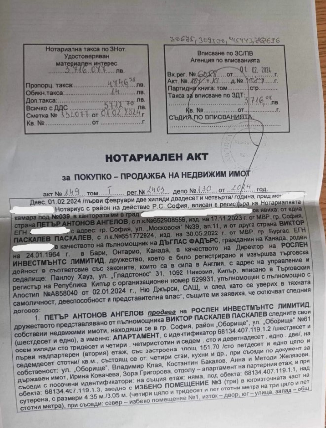 Петър Ангелов, представен в нотариалния акт като „единствен собственик на имота“ продава просторното жилище с четири стаи и обща площ от 151 квадрата на канадската фирма „Рослен Инвестмънтс“, чрез неин пълномощник в България.