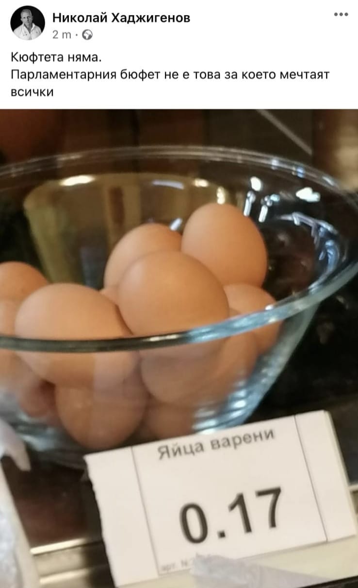 Кюфтета няма. Парламентарният бюфет не е това, за което го мислят всички, написа Хаджигенов под снимка с яйца от 17 стотинки от стола на Народното събрание.