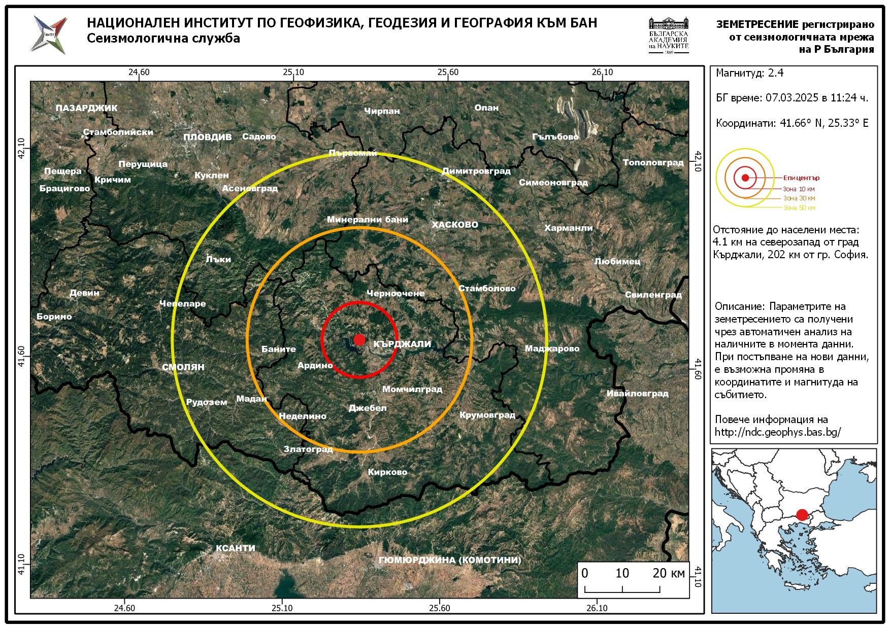 Епицентърът на труса е бил на 4.1 км на северозапад от град Кърджали и на 202 км от град София. Ударило е на плитка дълбочина от 15.2 км под земната повърхност, сочат данните на Националния институт по Геофизика, геодезия и география към БАН.