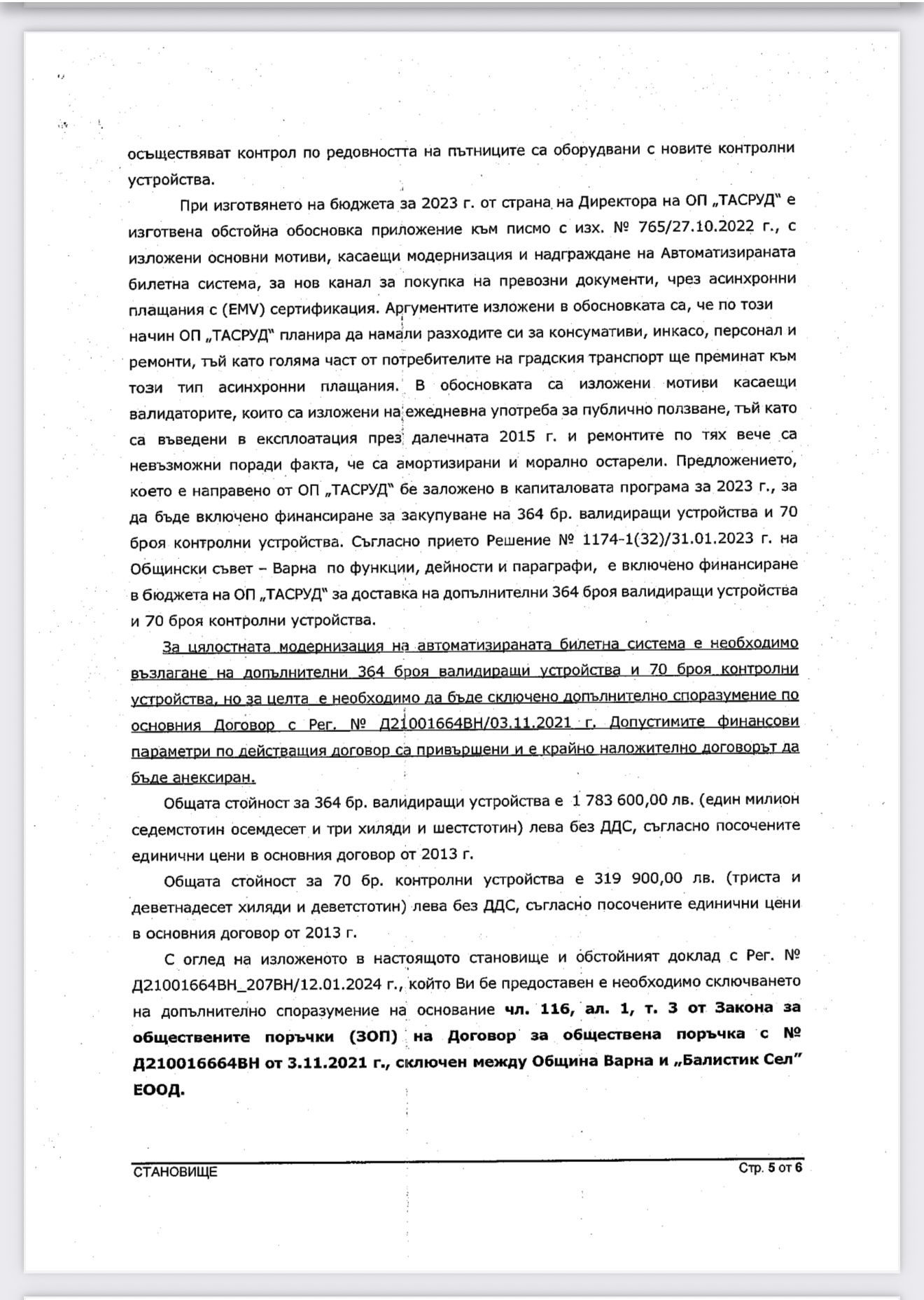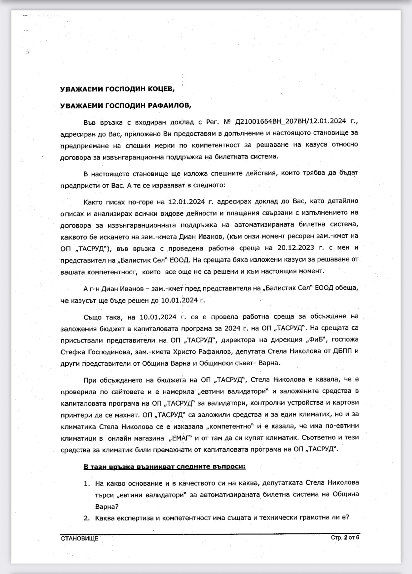 В сигнал до кмета Благомир Коцев, от 21 януари 2024 година, с който ПИК разполага, се казва: “На 12.01.2024 г. адресирах доклад до Вас, като детайлно описах и анализирах всички видове дейности и плащания свързани с изпълнението на договора за извънгаранционната поддръжка на автоматизираната билетна система, каквото бе искането на зам.-кмета Диан Иванов, (към онзи момент ресорен зам.-кмет на ОП „ТАСРУД"), във връзка с проведена работна среща на 20.12.2023 г. с мен и представител на „Балистик Сел" ЕООД. На срещата бяха изложени казуси за решаване от вашата компетентност, които все още не са решени и към настоящия момент. А г-н Диан Иванов - зам.-кмет пред представителя на „Балистик Сел" ЕООД обеща, че казусът ще бъде решен до 10.01.2024 г.