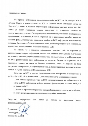 Оказва се, че такава Декларация не съществува и никой не я е видял! Опитът на Нинова по този начин да „отстреля“ хора от партията, които са неудобни, принуди един от засегнатите да изпрати остро писмо на възмущение до самата нея с копие до всички членове на Националния съвет. Галин Дурев отрича да е било свалено политическото доверие от него като заявява, че е разговарял със съпартийците си, които категорично са отрекли да са подписвали подобна декларация. Дурев настоява Нинова да каже кой партиен орган или член на БСП е първоизточник на публикувата в официалната страница на партията информация. Също така той настоява да му бъдат предоставени копия от партийните събрания в изброените общини от Пловдивска област, на които е гласувано снемането на доверието от него.