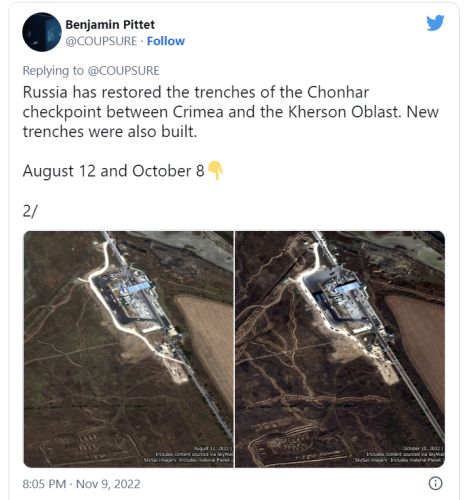 Подобни укрепления се строят и в Херсонска област, например около село Новотроицкое по пътя към Геническ. "Много други позиции могат да бъдат видяни в целия регион. Те строят крепост", пише Питет.