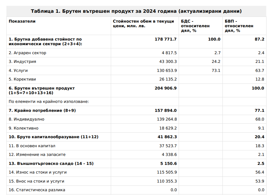 Според актуализираните данни на Националния статистически институт, през 2024 г. брутният вътрешен продукт (БВП) на България достига 204,907 млрд. лева в номинално изражение, като реализира реален ръст от 3,4% спрямо 2023 година. Брутната добавена стойност възлиза на 178,772 млн. лева.