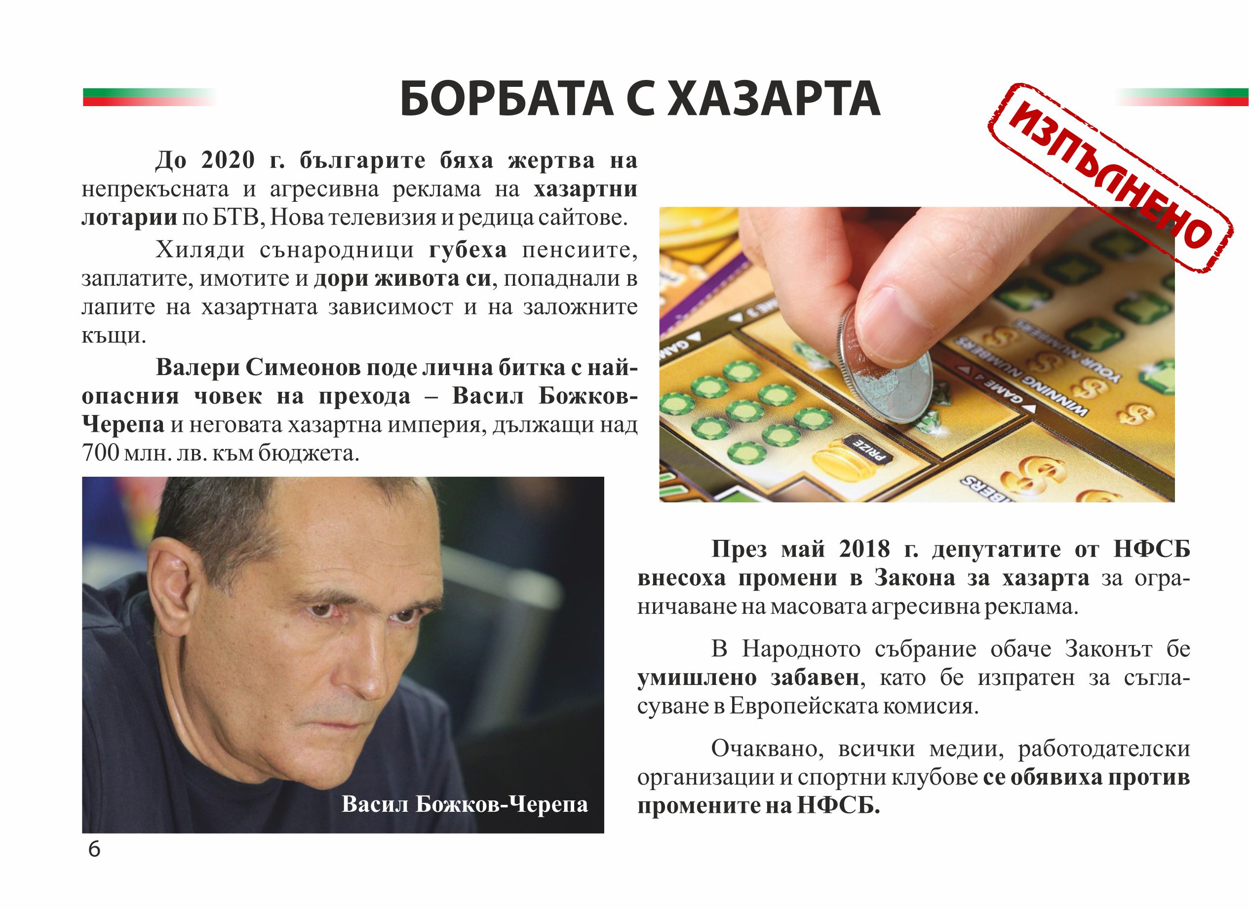 През май 2018 г. депутатите от НФСБ внесоха промени в Закона за хазарта за ограничаване на масовата агресивна реклама.