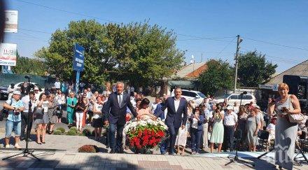 Българи в народни носии посрещнаха с хляб и сол Валери Симеонов, колегата му народен представител Йордан Апостолов и Сергей Желев пред Почетното консулство на България, което се намира на историческия остров Хортица.