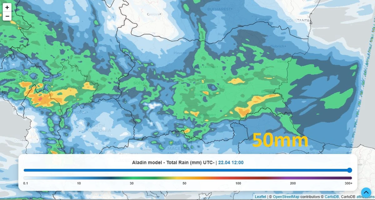 Според последните прогнози на модела ALADIN, сумарните количества валежи в страната могат да достигнат до около 50 мм/кв.м до 22 април. Най-интензивни ще бъдат валежите в централните и южните райони, докато в крайните северозападни части ще остане почти без съществени превалявания.