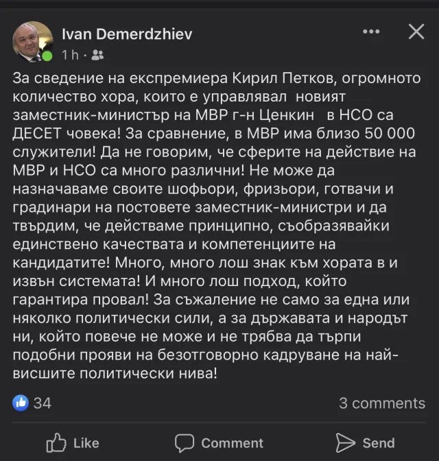 За сравнение, в МВР има близо 50 000 служители. Да е говорим, че сферата на дейстие на МВР и НСО са много различни. Не може да назначаваме своите шофьори, фризьори, готвачи и градинари на постовете заместник-министъри и да твърдим, че действаме принципно, съобразявайки единствено качествата и компетенциите на кандидатите", заяви бившият служебен министър Иван Демерджиев в социалната мрежа.