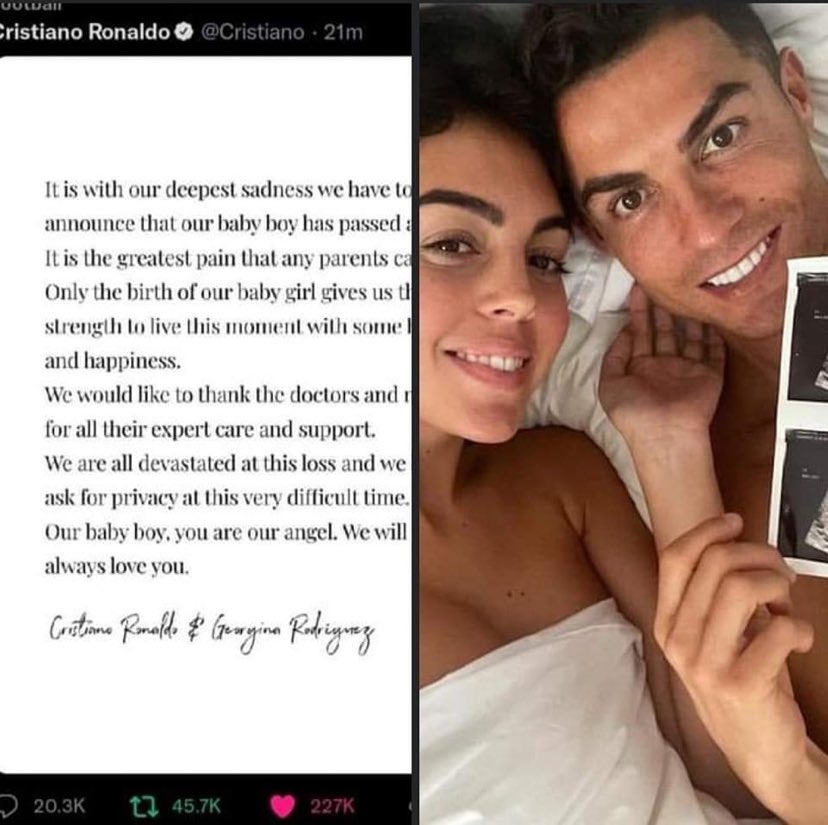 Тъжната новина споделия самият Роналдо в социалните мрежи. Двойката очакваме момче и момиче, но момченцето е загубило живота си.