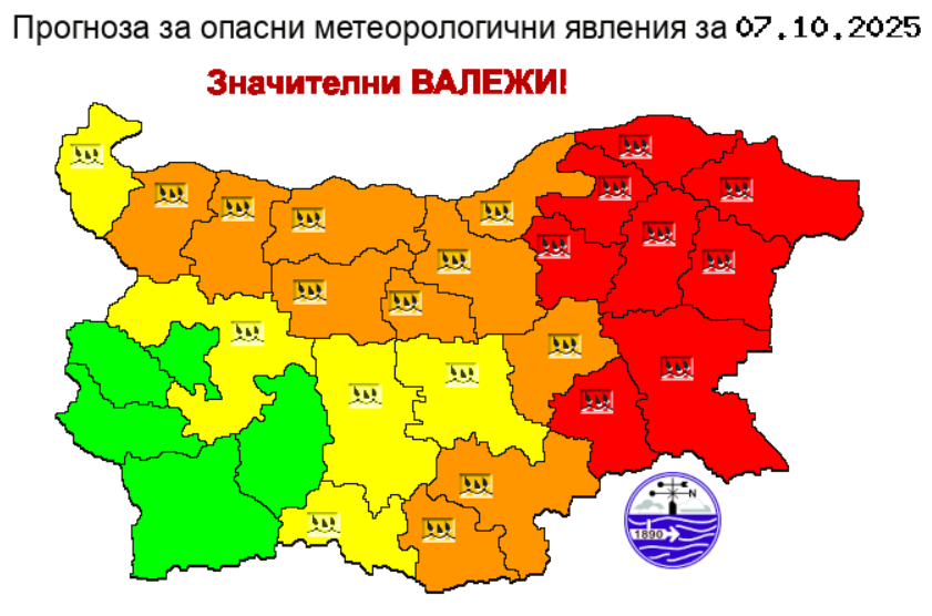 ОПАСНИ ВАЛЕЖИ! Проливен дъжд над цялата страна, 7 области в Източна България с червен код (КАРТИ)