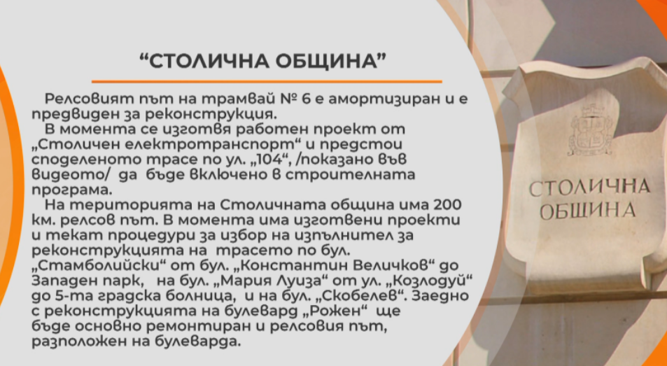 От Столична община заявиха за БНТ, че релсовият път на трамвай номер 6 е предвиден за реконструкция.