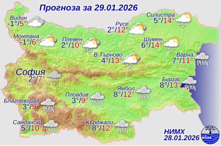 През днешния ден времето в страната ще е под влияние на средиземноморски циклон. Ще бъде предимно облачно, на места в равнините – и мъгливо. След временно отслабване и спиране на валежите, още преди обяд от юг те отново ще се активизират и до вечерта ще обхванат почти цялата страна. Значителни количества на валежите ще има в Южна България. В югоизточните райони са възможни и гръмотевици. В Северозападна България ще бъде почти без валежи. Вятърът ще отслабне и за кратко ще се ориентира от юг-югоизток, а след обяд – от север-североизток и привечер в Североизточна България ще се усили. Максималните температури ще бъдат предимно между 7° и 12°, малко по-високи в Източна България, в София – около 7°.