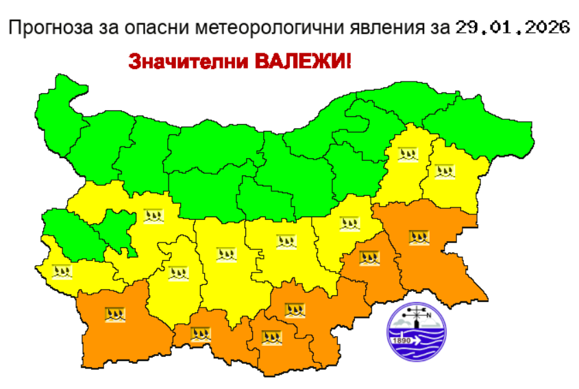 Оранжев и жълт код за интензивни валежи обяви НИМХ за четвъртък – 29 януари.