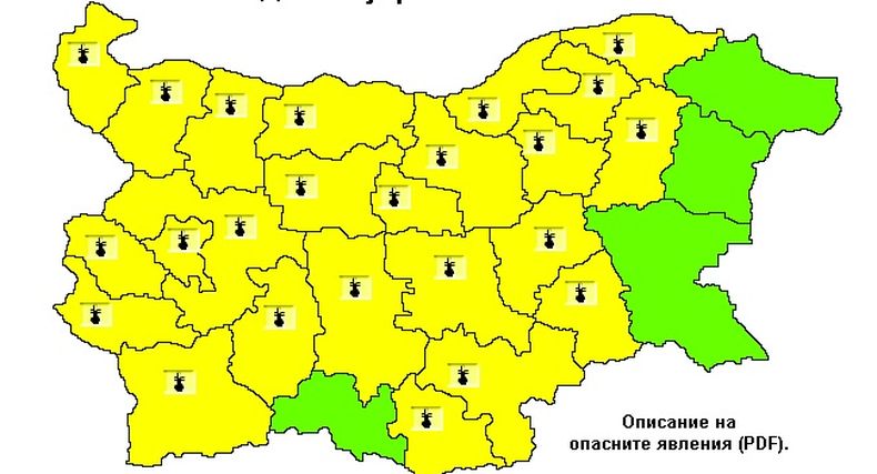 Издадено е предупреждение от първа степен (жълт код) за високи температури за 24 области.