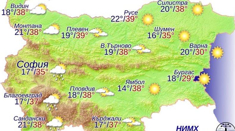 Слънчево и опасно горещо време ни очаква днес. След обяд над планините на Западна България ще се развива купеста облачност и на отделни места ще има краткотрайни валежи с гръмотевици, съобщават от Националния институт по метеорология и хидрология (НИМХ), цитирани от „Фокус”.