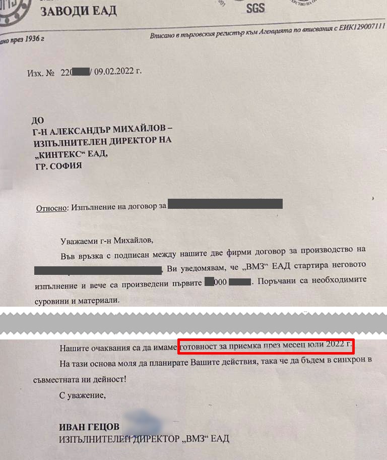 През м. януари тази година "Кинтекс" възлага на ВМЗ поръчка за артилерийски боеприпаси и заплаща съответния аванс. Преди да бъде уволнен от Нинова, директорът на предприятието инж. Гецов потвърждава предсрочна доставка още през м. юли и съобщава, че към 9 февруари част от количествата вече са произведени (вижте официалното писмо).