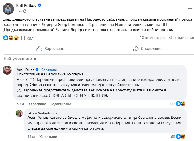 В изключително тежка ситуация се поставиха лидерите на "Продължаваме промяната" Кирил Петков и Асен Василев, които по-рано днес изключиха Даниел Лорер от партията и поискаха оставката му като народен представител, както и тази на Явор Божанков.