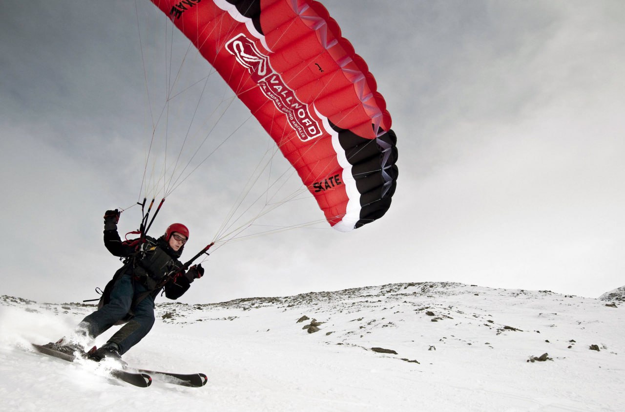Брегмен не просто се спусна по стръмен, необработен леден склон, но използва скоростта, за да се изстреля от ръба на гигантска пропаст и да полети с парашута си над бездната.