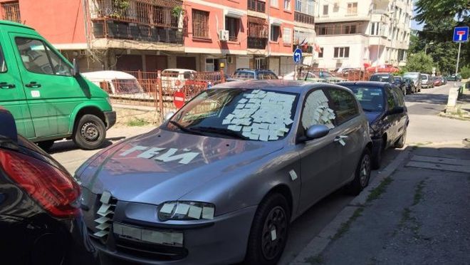 Очевидец изпрати поредната интересна случка от София, заснета в кадъра. Човекът видял автомобил, по който се развявали лепещи листчета, образуващи неприличен надпис.