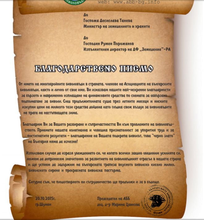 От името на многобройните биволовъди в страната, членове на Асоциацията на българските биволовъди, както и лично от свое име, Ви изказвам нашите най-искрени благодарности за бързото и навременно изплащане на финансовите средства по схемата за обвързано подпомагане на биволи. След продължителната суша през летните месеци и ниските изкупни цени на млякото тези средства дойдоха като глътка свеж въздух за биволовъдите на прага на настъпващата зима.