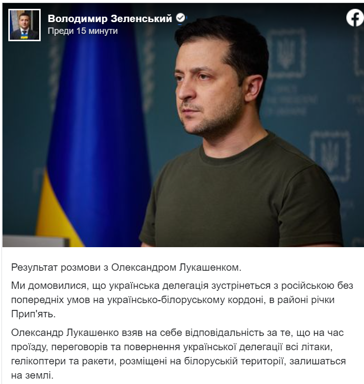 „Разбрахме се, че украинската делегация ще се срещне с руската без предварителни условия на украино-беларуската граница, близо до река Припят”, съобщи украинският президент Володимир Зеленски.
