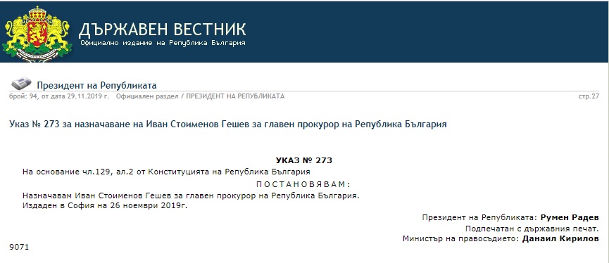 Назначението на зам.-главния прокурор Иван Гешев за следващ "обвинител №1" вече е напълно официално. Указ № 273 на президента Румен Радев е публикуван в последния брой на "Държавен вестник".
