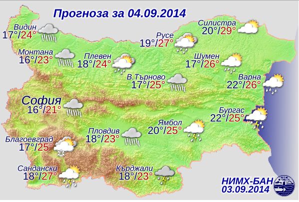 Максималните температури ще бъдат от 20-21° в Софийско до 29° в североизточните райони от страната.
