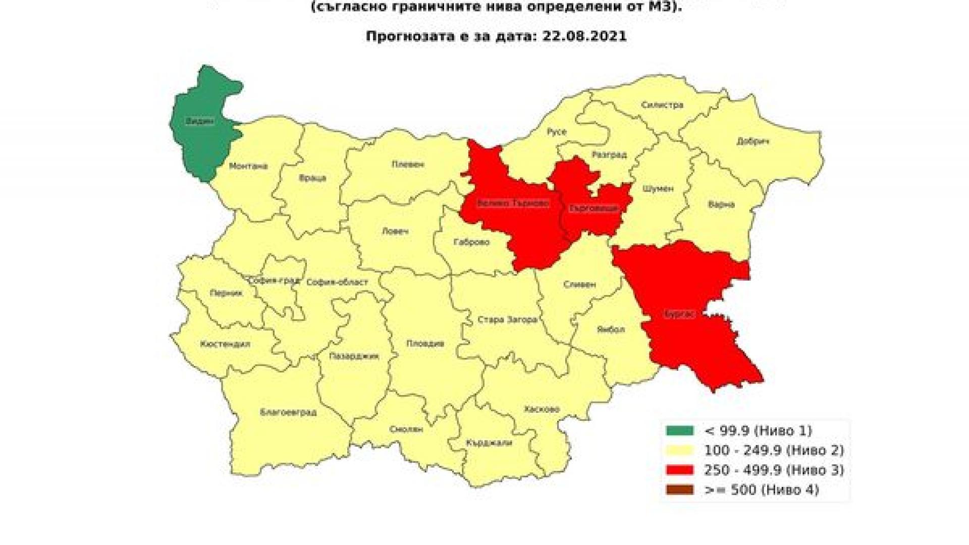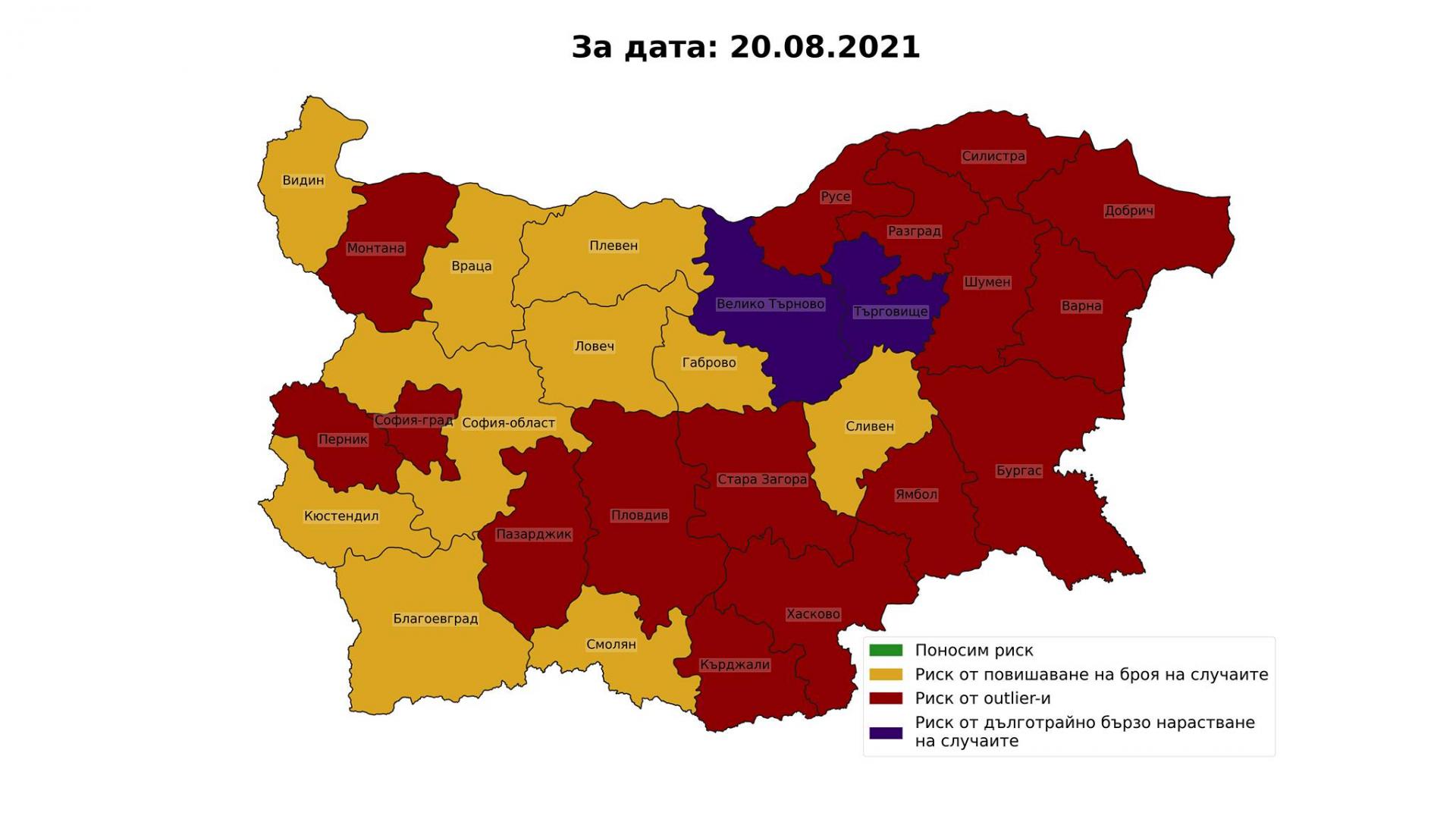 Сега картите. Най-напред картата на риска съгласно плана на Министерството на здравеопазването. Има 4 области, където лятото продължава, но Кърджали е на път да излезе от тази лятна идилия. Благоевград и той, но ще поседи повечко в тази зона. В по-голямата част на страната е жълто, тоест спокойно, но трябва малко внимание и спазване на елементарните мерки. В областите в червено вече трябва повечко внимание.