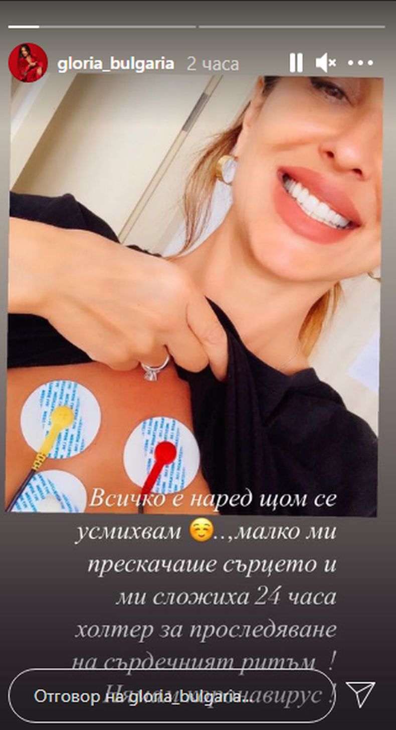 "Всичко е наред щом се усмихвам... Малко ми прескачаше сърцето и ми сложиха 24 часа холтер за проследяване на сърдечния ритъм!", информира последователите си примата на фолка.