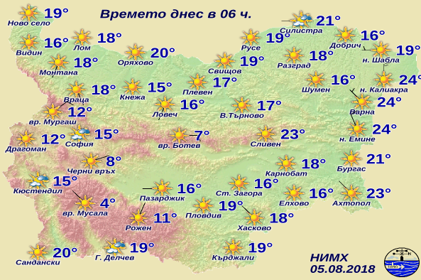Днес времето ще е предимно слънчево, в следобедните часове с временни увеличения на облачността над планините, но валежи са малко вероятни. Ще духа слаб до умерен вятър от изток-североизток. Максималните температури ще са между 29° и 34°.