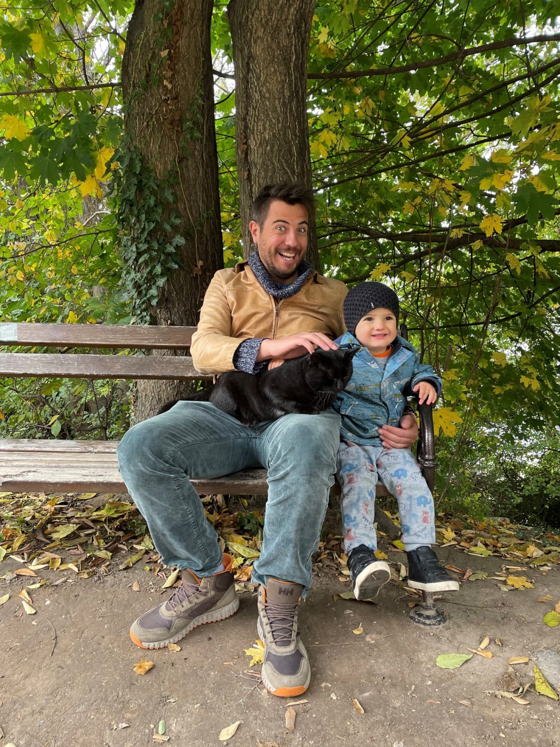 Съпругът й позира за снимка заедно с черна улична котка, гушнал сина си. Момченцето видимо се радва на пухкавото животно, което искат да си приберат у дома.