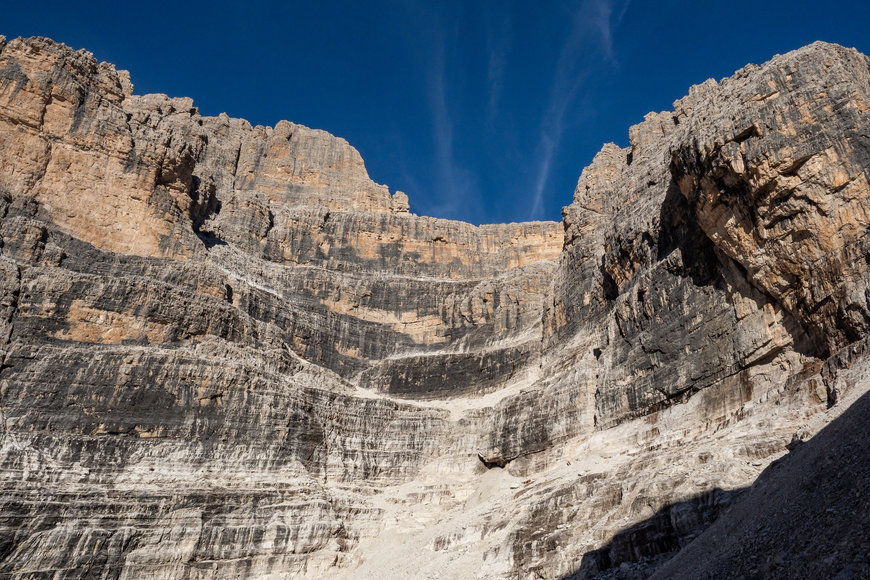 От птичи поглед емблематичните върхове като Трите чими (Tre Cime di Lavaredo) и масивът Тофана изглеждат почти на една ръка разстояние, разкривайки геоложки детайли, които остават скрити от ски пистите.