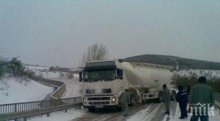 При над 10 сантиметра сняг и на баир закъса ТИР с датска регистрация. Натоварен с говеда закъсал на стръмното към хасковското село Стамболийски снощи към полунощ. Машината застанала напряко на пътя и всякакви опити да мръдне останали безуспешни.