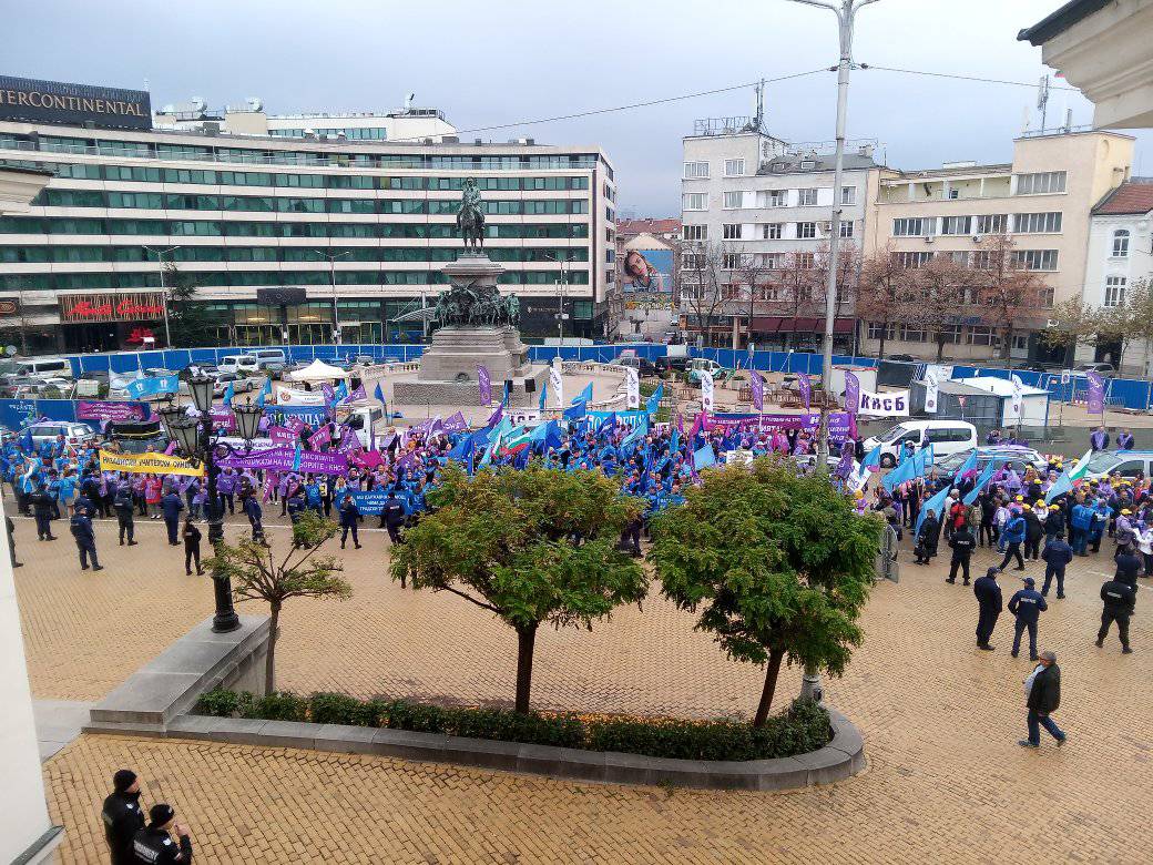 Голям национален протест на двата основни синдиката се провежда в този час в София. КНСБ и КТ „Подкрепа“ организират автошествие по централни софийски улици и митинг пред сградата на Народното събрание.