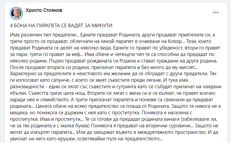 Има различен тип предатели... Едните предават Родината, други продават приятелите си, а трети просто се продават, облегнати на някой парапет в очакване на Кокор... Тези, които предават Родината се делят на няколко вида.