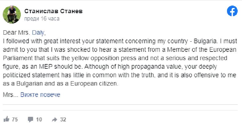 Пловдивският адвокат Станислав Станев изпрати открито писмо да ирландската крайно лява евродепутатка Клеър Дейли. Преди дни по време на заседание на Комисията за граждански свободи, правосъдие и вътрешен ред Дейли отправи остри критики към управлението в България, отношението към малцинствата, медиите и действията на прокуратурата.