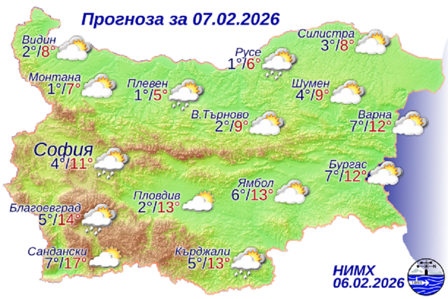 Максималните температури в Северна България ще бъдат между 5° и 10°, в Южна – между 11° и 14°, в крайните югозападни райони до 17°, в София 10°-11°.