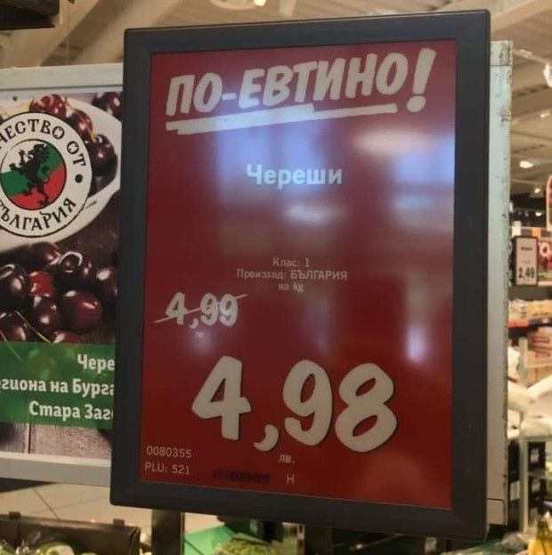 Намаленият продукт са череши в голяма търговска верига. Сладкият плод е с редовна цена от 4,99 лева, а на промоция е 4,98 лв. Доколкото това може да бъде успокоително на фона на бутафорната ситуация - черешите са с произход България.