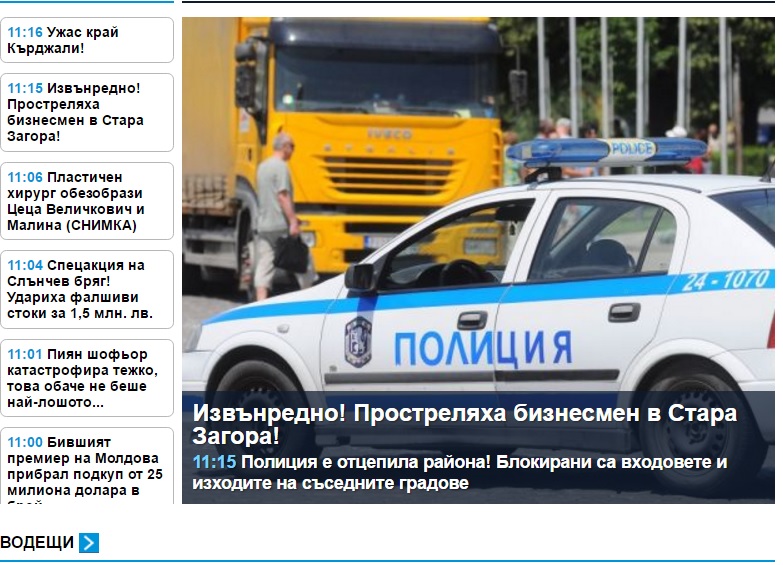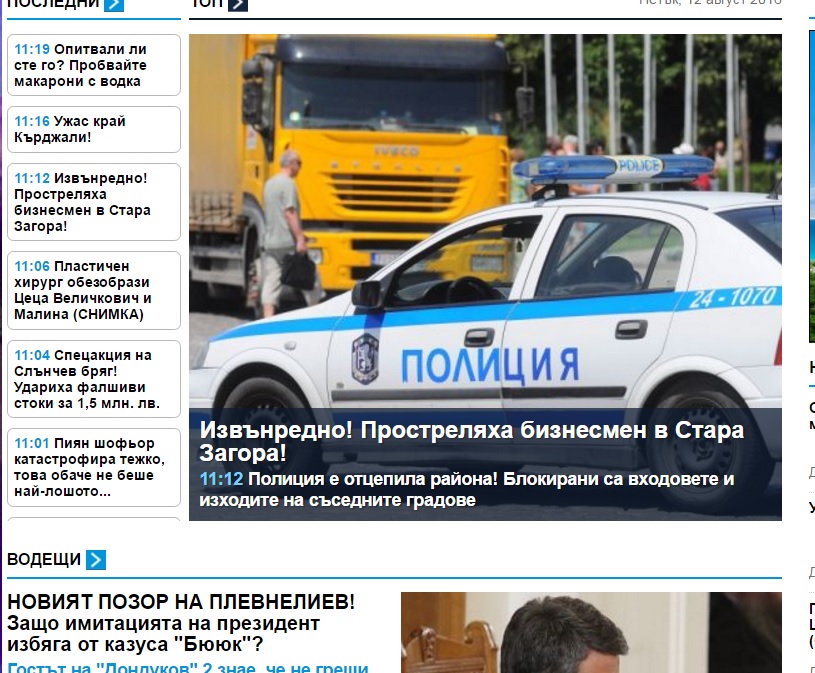 Немощният сайт БЛИЦ мами позорно читателите си в опита да се представи за най-бързата медия, но със скандална манипулация. Пускат новината за простреляния бизнесмен в Стара Загора, преписана нелегално от БГНЕС, за който нямат абонамент, много след като вече е излязла в Агенция ПИК. След това обаче идва ред на позорната измама - връщат си часовника и излиза, че са я пуснали преди всички, а може би и преди да е прострелян бизнесменът. Снимките говорят сами за позорната им изцепка, която се повтаря ежедневно и ежечасно за всякакви новини.