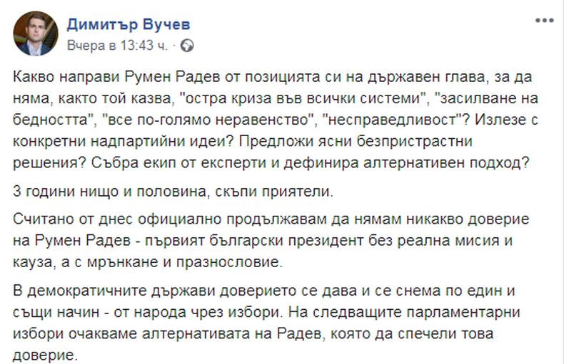 "Какво направи Румен Радев от позицията си на държавен глава, за да няма, както той казва, "остра криза във всички системи", "засилване на бедността", "все по-голямо неравенство", "несправедливост"? Излезе с конкретни надпартийни идеи? Предложи ясни безпристрастни решения? Събра екип от експерти и дефинира алтернативен подход?", написа политологът Димитър Вучев по повод поредната опозиционна реч на Румен Радев довела до политически трус у нас. Преди ден от "Дондуков 2" в обръщение към нацията, Радев заяви, че свалял доверието си от правителството, че на всичко отгоре призова и за обединение за каузата си.
