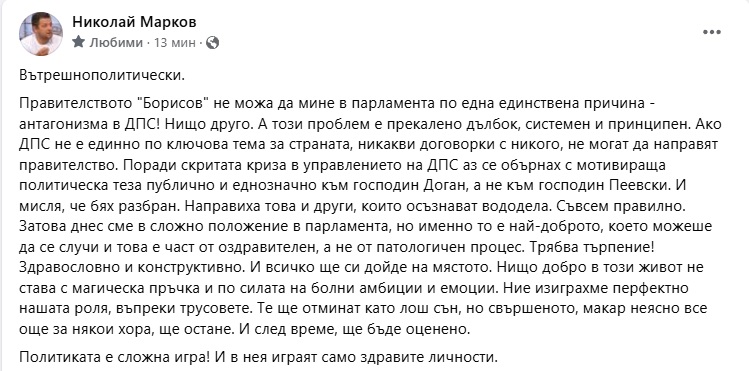 Правителството "Борисов" не можа да мине в парламента по една единствена причина - антагонизма в ДПС! Нищо друго. А този проблем е прекалено дълбок, системен и принципен. Ако ДПС не е единно по ключова тема за страната, никакви договорки с никого, не могат да направят правителство. Поради скритата криза в управлението на ДПС аз се обърнах с мотивираща политическа теза публично и еднозначно към господин Доган, а не към господин Пеевски. И мисля, че бях разбран. Направиха това и други, които осъзнават вододела. Съвсем правилно.