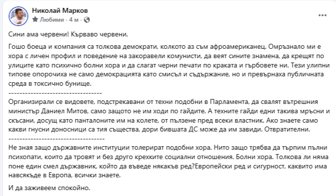 Гошо Боеца и компания са толкова демократи, колкото аз съм афроамериканец. Омръзнало ми е хора с личен профил и поведение на закоравели комунисти, да веят сините знамена, да крещят по улиците като психично болни хора и да слагат черни печати по краката и гърбовете ни. Тези типове опорочиха не само демокрацията като смисъл и съдържание, но и превърнаха публичната среда в токсично бунище.
