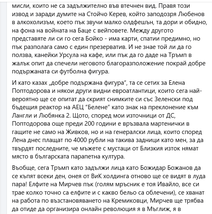 "Сетих се за Елена Поптодорова и някои други видни евроатлантици, които сега най-вероятно ще се опитат да скрият снимките си със Зеленски под бъдещия реактор на АЕЦ "Белене" като знак на преклонение към Лангли и Любянка 2. Щото, според мои източници от ДС, Поптодорова още преди 200 години е връзвала мартенички в гащите не само на Живков, но и на генералски лица, които според Лена днес плащат по 4000 рубли на такива задници като мен, за да твърдят последните, че мъжете с мустаци от Близкия изток нямат място в българската парапетна култура.