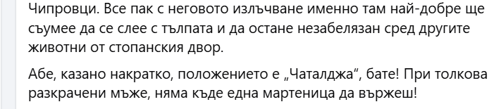 И заявява: "Абе, казано накратко, положението е "Чаталджа", бате! При толкова разкрачени мъже, няма къде една мартеница да вържеш".